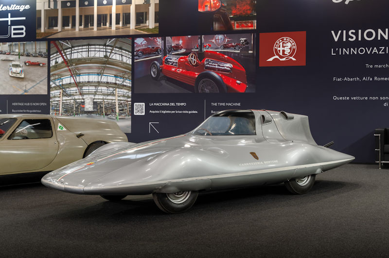 Das in Bologna gezeigte Modell ist der zweite, vereinfachte Prototyp mit Linkslenkung, konventioneller Windschutzscheibe und normalen Türen – ein einzigartiges Exemplar, das im Alfa Romeo Museum in Arese sorgfältig bewahrt wird und die Erinnerung an dieses außergewöhnliche Kapitel der Marke lebendig hält.