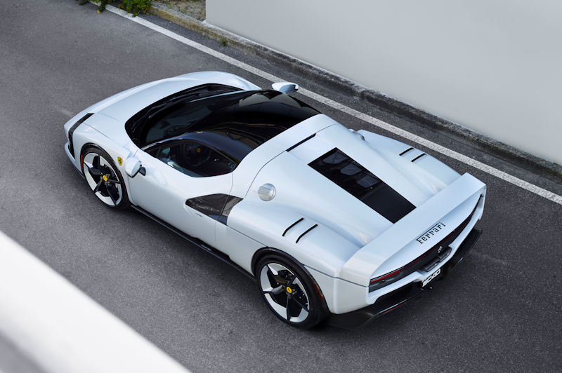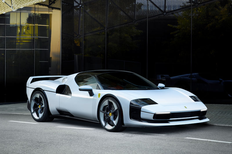 Das Design-Thema ist vom Industriedesign inspiriert, das sich durch präzise Geometrien und muskulöse, kantige Volumen auszeichnet. Die Proportionen zeichnen sich durch eine lange, niedrige Nase aus, die durch einen kurzen hinteren Überhang und einen hohen, feststehenden Heckflügel – lackiert in der für das Fahrzeug maßgeschneiderten Farbe SC40 White – ausgeglichen wird, der sich von den Flanken der Karosserie aus erstreckt. Der feste Spoiler erstreckt sich vertikal von der Motorhaube und geht nahtlos in diese über, hervorgehoben durch eine schwarze Trennlinie, die die schwarze Heckschürze betont. Dieser Bereich besteht aus einem offenen Gitter, das die darunter liegenden mechanischen und strukturellen Komponenten sichtbar macht. Der V6-Motor wird durch markante, getönte Lexan®-Lamellen präsentiert, die optisch mit dem unteren Lufteinlass verbunden sind und durch kleinere Lamellen ergänzt werden, die in die muskulösen Heckflügel in der Nähe der Radkästen eingearbeitet sind. Der skulpturale Heckbereich wird durch einen zentralen Auspuff aus additiver Fertigung mit Endrohren aus Titan und Kohlefaser sowie durch Rückleuchten vervollständigt, die deutlich auf den 296 GTB hinweisen, auf dem das Fahrzeug basiert.
