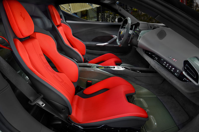 Im Innenraum wurde besonderes Augenmerk auf die Verwendung von Kevlar gelegt, einem Material, das stark an den F40 erinnert. Das Carbon-Kevlar wurde für dieses Projekt neu interpretiert und weiterentwickelt und kommt im Fußraum, hinter den Sitzen und auf Teilen der Fußmatten zum Einsatz. Dieses unverwechselbare Material wird auch für das Lenkrad, einige Armaturenbretteinsätze, den Motorraum und den Kofferraum verwendet. Die Polsterung besteht aus einer Kombination aus Charcoal Alcantara® und einem roten Jacquard-Technikgewebe, während das springende Pferd auf den Kopfstützen und das gewebte SC40-Logo den Sitzen einen zeitgemäßen und exklusiven Look verleihen.
