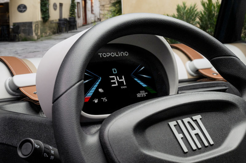 Fiat Topolino [2026]Die Bedienung des Fiat Topolino wird durch das neue Zentraldisplay noch intuitiver. Das hinter dem Lenkrad positionierte Kombiinstrument wurde um rund 60 Prozent auf jetzt 5,7 Zoll Bildschirmdiagonale vergrößert. Die Anzeige weist darüber hinaus vereinfachte Grafiken, verbesserte Lesbarkeit sowie eine hellere und freundlichere Optik auf.