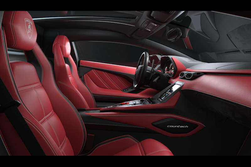 Der Countach LPI 800-4 wird heute bei The Quail (USA) in der Sonderfarbe Bianco Siderale vorgestellt, die einen Hauch von Perlmuttblau enthält und an Ferruccio Lamborghinis eigenen Countach LP 400 S erinnert, komplett mit rot-schwarzer Lederausstattung. Auch das Interieur nimmt Anleihen beim Original-Countach im Kontext eines modernen Fahrzeugs. Das klassische und luxuriöse Leder der speziell entworfenen Komfortsitze und des Armaturenbretts ist mit geometrischen Nähten versehen. Das quadratische Motiv verweist auf den kühnen Stil und den Optimismus von Design und Technologie der 1970er-Jahre.